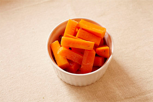 きのうの"きょうの昼ご飯"つづき。にんじんの付け合わせ にんじん、塩、酢、オリーブオイル、胡椒を合える。